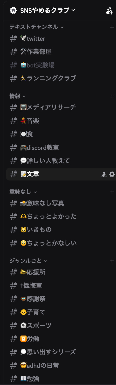 SNSやめる部員(有料会員)向けのDiscordが最近いい感じに動いています。ぼくがXに書きたいことがなくなりすぎたのでそっちに書いてます。最近はわたしとシガくんとまりえさんのサッカー談義、みやうーと英字くんの経理トークが盛り上がりがちです。あと草野さんの電子工作作業報告もおもろいです。有料会員の方は招待リンクからぜひ。ご興味ある方は1ヶ月おためしとかでもぜひ。下記から「Monthly」とかを選ぶと部員登録できます。そろそろSNSやめるクラブへようこそ文章書き直そうかな。あとレターも名前自体も検討する時期かも。